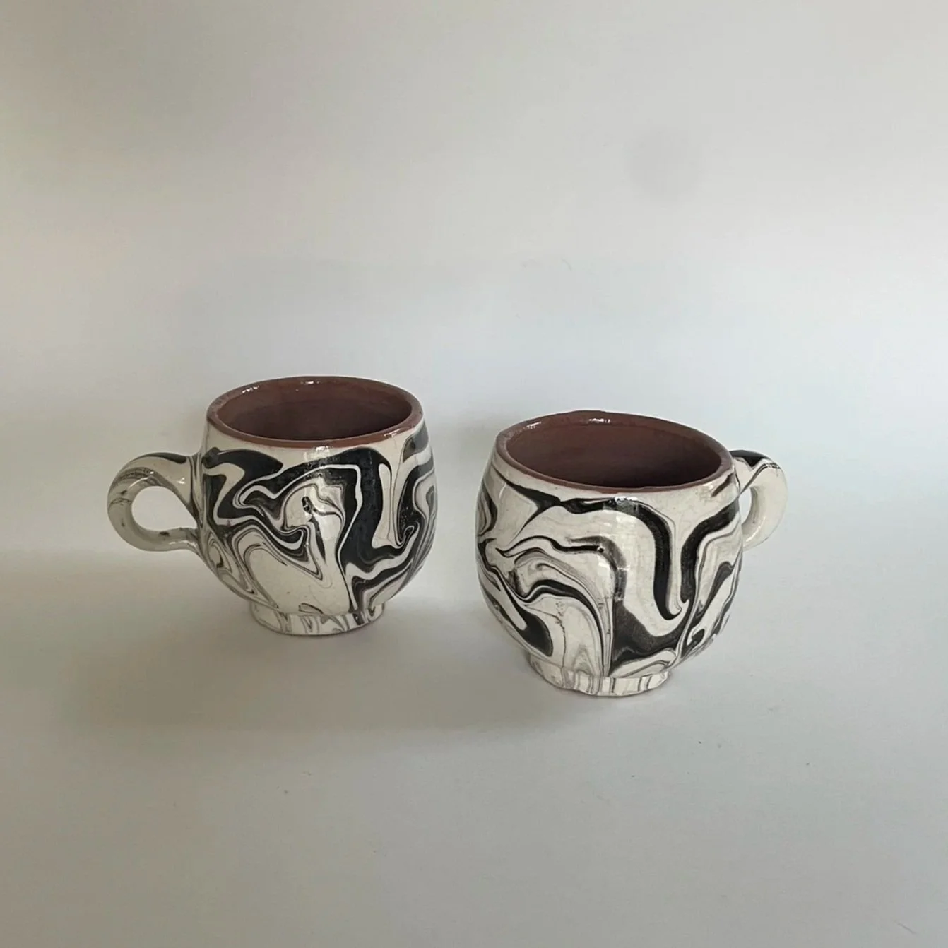 Black and White Swirl Ceramic Coffee Cups Modern Artisan Drinkware Unique Footed Base Clay Mug Set